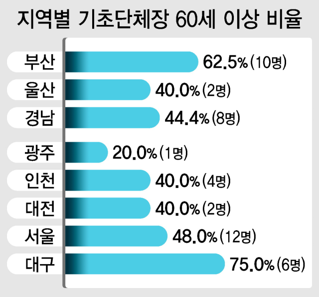 3일 〈부산일보〉가 중앙선거관리위원회 선거통계시스템을 통해 주요 광역시 기초단체장 당선인 통계를 분석한 결과, 부산 기초단체장은 고령화와 특정 배경 쏠림이 뚜렷하게 나타났다. 2022년 실시된 제8회 지방선거에서 부산 기초단체장(구청장·군수) 당선인 16명 중 10명(62.5%)이 60대 이상이었고, 50대는 6명을 기록했다. 40대는 한 명도 없었다.