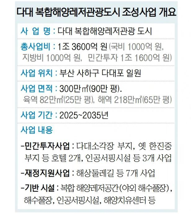 부산시가 제출한 최종사업 계획서 ‘다대 복합해양레저관광도시 조성사업’에 따르면, 사업 대상지는 부산 사하구 다대포 일원 300만㎡(약 90만평, 육역 82만㎡·해역 218만㎡)다. 시는 재정투자 2000억 원(국비·지방비 각 1000억 원), 민간투자 1조 1600억 원 등 총사업비 1조 3600억 원을 투입해 올해부터 2035년까지 다대포 일원을 서부산의 대표적인 해양레저관광도시로 조성할 계획이다.