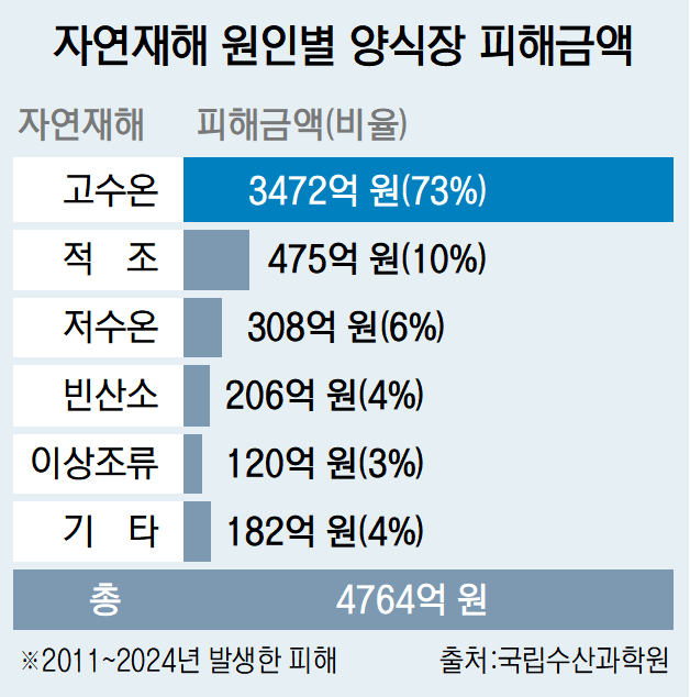 고수온으로 인한 피해는 다른 자연 재해와 비교하면 압도적인 수준이다. 2011년부터 14년간 발생한 자연재해 중 금액 기준 고수온 피해가 73%를 차지했다.