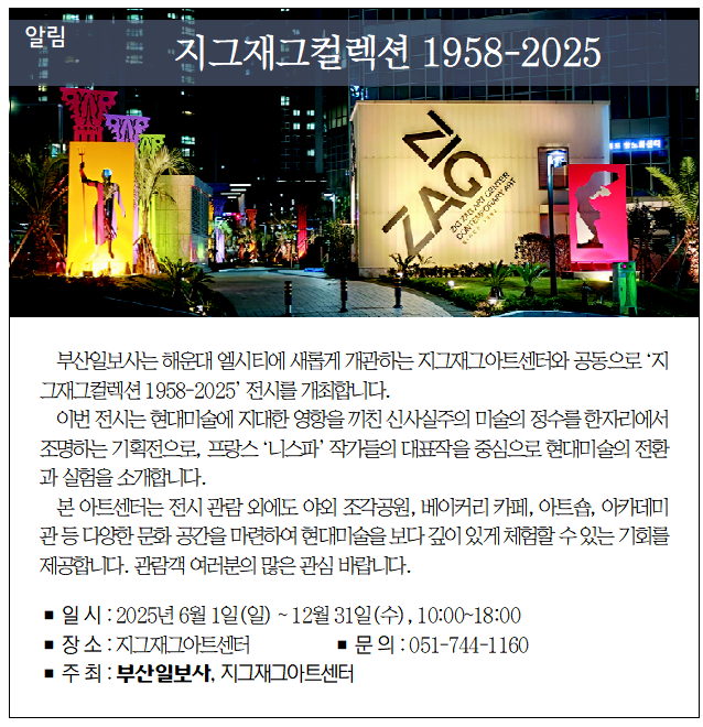 부산일보사는 해운대 엘시티에 새롭게 개관하는 지그재그아트센터와 공동으로 '지그재그컬렉션 1958-2025' 전시를 개최합니다.