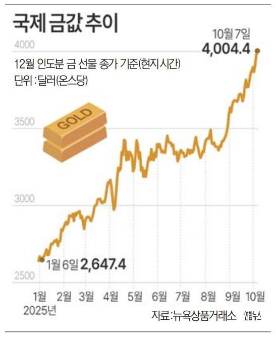 8일(현지 시간) 미국 뉴욕상업거래소에 따르면 12월 인도분 금 선물 종가는 온스당 4070.5달러(한화 약 577만 원)로, 전장보다 1.7% 올라 종가 기준 사상 최고치 기록을 다시 썼다. 금 선물 가격은 전날 사상 처음으로 온스당 4000달러(약 565만 원)선을 돌파한 데 이어 이날 추가 상승으로 4000달러대 위로 안착했다.