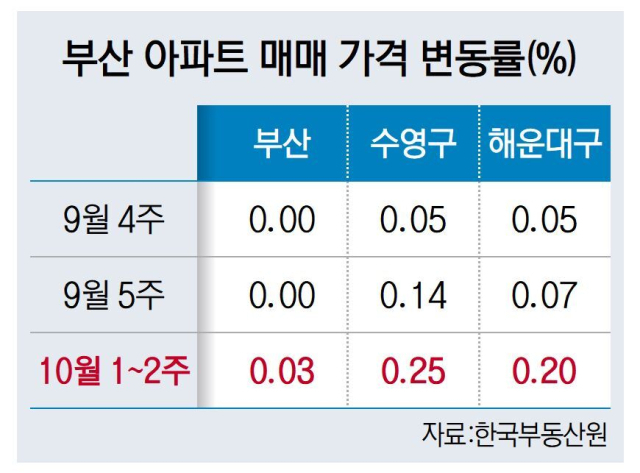 16일 한국부동산원의 10월 둘째 주(10월 13일 기준) 전국 주간 아파트 가격 동향에 따르면 부산 아파트 매매가격은 전주 대비 0.03%로 올랐다. 2022년 6월 20일 시작된 부산 아파트 매매가격 하락은 3년 4개월여간 이어졌다. 낙폭이 컸던 2022년 12월엔 한 주에 0.7%씩 빠졌고, 이 기간의 하락 폭을 모두 더하면 -20%에 달한다.