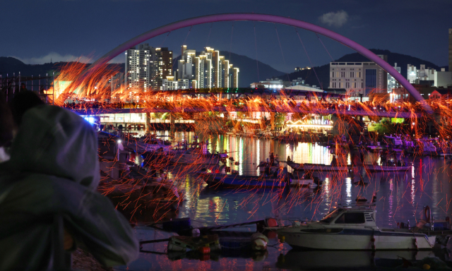 올해로 3회째를 맞는 ‘장림항 부네치아 아트프리마켓’ 행사의 하이라이트인 낙화놀이가 18일 오후 부산 사하구 장림항에서 열려 관람객들의 뜨거운 호응을 얻었다. 낙화놀이는 공중에 매달린 줄에 숯가루를 넣어 불을 붙이면 불꽃이 위에서 아래로 떨어지며 장관을 만드는 전통 불꽃놀이다.