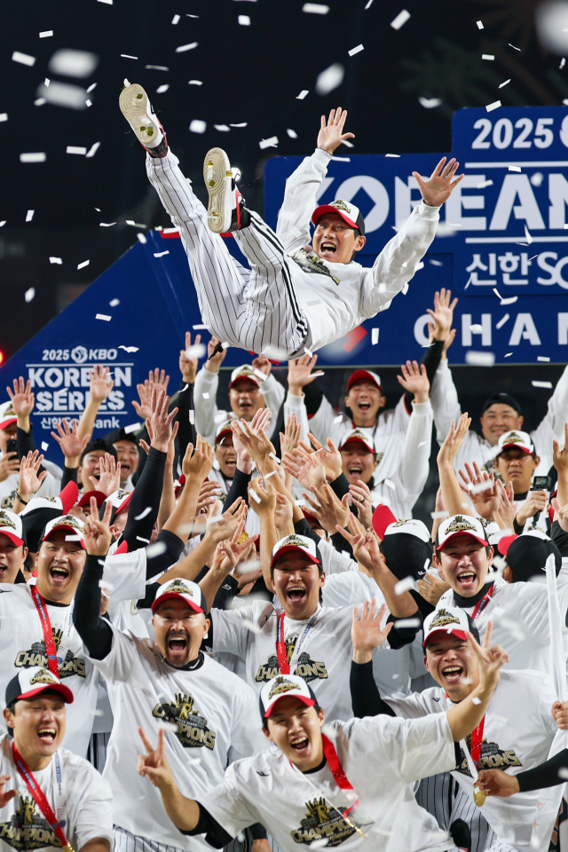 지난달 31일 대전한화생명볼파크에서 열린 2025 프로야구 KBO리그 한국시리즈 시상식에서 통합 우승을 차지한 LG 트윈스 선수들이 염경엽 감독을 헹가래 치며 기뻐하고 있다. 연합뉴스