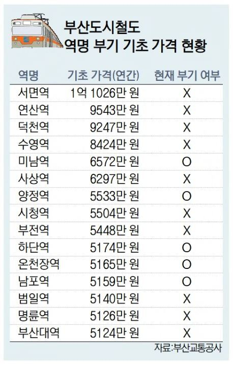 교통공사가 부기 역명을 판매하는 이유는 도시철도 운영 적자에 있다. 지난해 부산도시철도 수송 원가(1인당 도시철도 운영 비용)는 2660원으로 1인당 운임 859원 대비 1800원가량 적자다. 시설 노후화로 안전 관리비도 늘어나면서 안정적인 수입원이 절실한 상황이다.
