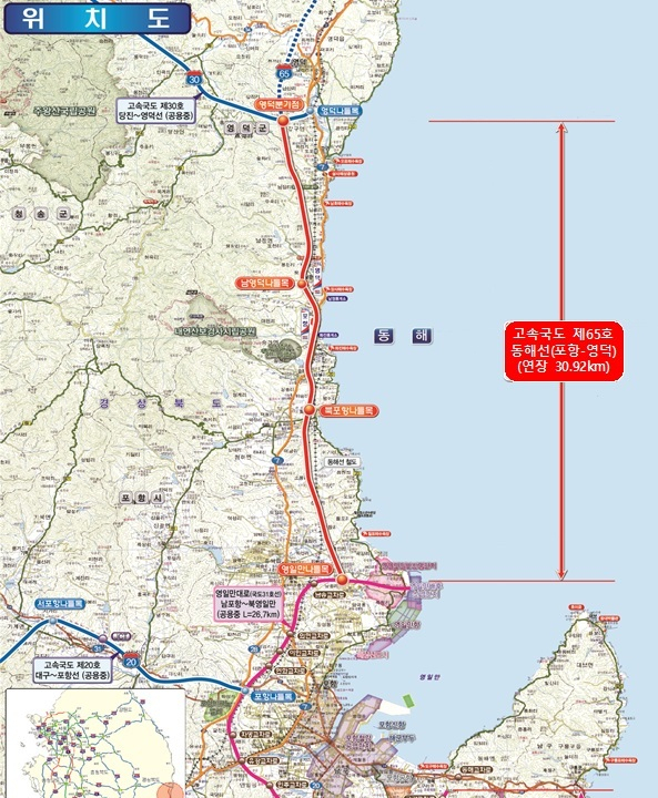 동해안을 쭉 타고 올라가는 동해고속도로 포항–영덕 구간이 개통된다.