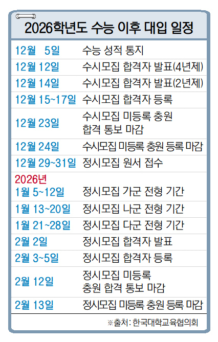 이만기 유웨이교육평가연구소장은 “가채점 결과를 토대로 백분위와 표준점수를 정밀하게 파악하고, 희망 대학·학과의 정시 지원 가능성을 따져봐야 한다”며 “수시에 지원했다면 수능최저학력기준 충족 여부를 점검하고 논술·면접 등 대학별고사 준비에 집중하는 것이 중요하다”고 조언했다.