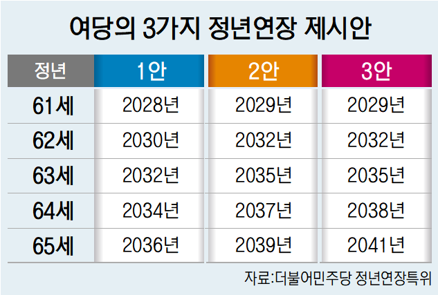민주당이 제시한 1안은 2028년부터 2036년까지 2년 간격으로 정년을 1년씩 올리는 방식이다. 2028년 61세로 시작해 2036년 65세에 도달한다. 2안은 2029년부터 2039년까지 2·3년 주기로 1년씩 연장하는 방안으로, 2029년 61세에서 출발해 62세와 63세는 3년 간격으로, 64세와 65세는 2년 간격으로 상향해 2039년 65세가 된다. 3안은 2029년부터 3년마다 1년씩 연장하는 방식으로, 2029년 61세로 올린 뒤 2041년 65세에 도달한다.