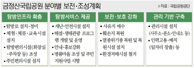 국립공원공단 관계자는 “기존 공원 계획이 전무했던 지역인 만큼 화장실·편의시설·탐방로·지자체별 요구 사업 등 필요시설을 전수 조사하고 정비 물량에 대한 수요를 파악해야 한다”며 “이를 토대로 내년 1년 동안 향후 사업 물량과 예산 산출의 객관적 근거를 마련하는 절차가 필요하다”고 설명했다.