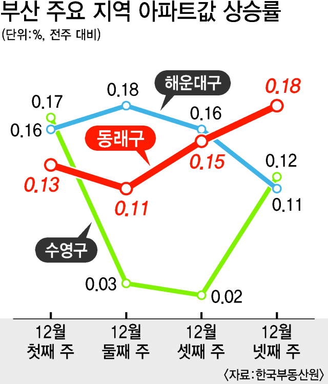 부산 아파트 가격은 기존 강세 지역인 해운대구와 수영구, 동래구 중에서도 동래구가 견인하는 모양새다. 구·군별로 보면 상승률 1위인 동래구(0.18%)가 2·3위인 수영구(0.12%), 해운대구(0.11%)를 압도했다. 동래구는 온천·사직동 대단지 위주로, 수영구는 남천·민락동 대형 규모 위주로, 해운대구는 좌·우동 선호 단지 위주로 상승세가 두드러졌다.