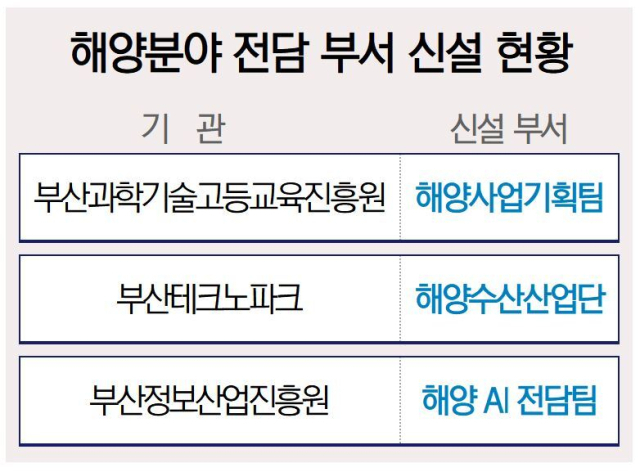 연구, 기업 지원을 직접 수행하는 기관들도 해양 전담 부서를 가동 중이다. 부산테크노파크는 지난해 8월 해양 ICT센터와 블루푸드센터로 구성된 ‘해양수산산업단’을 신설했다. 부산정보산업진흥원도 비슷한 시기에 ‘해양 AI TF단’을 신설하고 해양 AI전략위원회를 구성해 현재 운영 중이다.