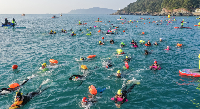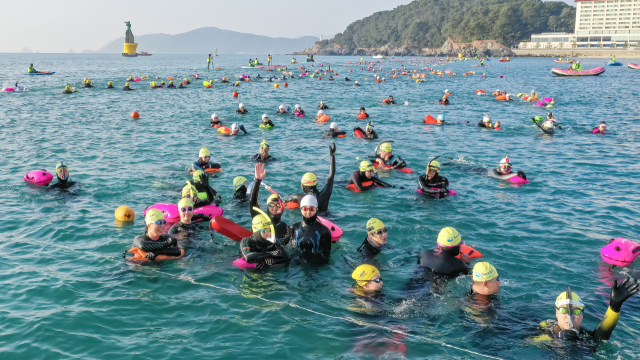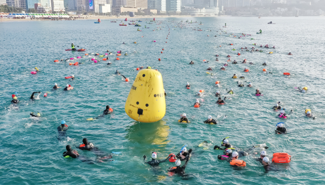 BBC가 선정한 ‘세계 10대 이색 스포츠 축제’로 손꼽히며 국제적 주목을 받고 있는 ‘제39회 해운대 북극곰축제’가 18일 부산 해운대해수욕장에서 부산일보 주최로 개최됐다. 식전 행사로 부울경바다수영협회가 주관하는 1km 동행 수영이 진행되고 있다.