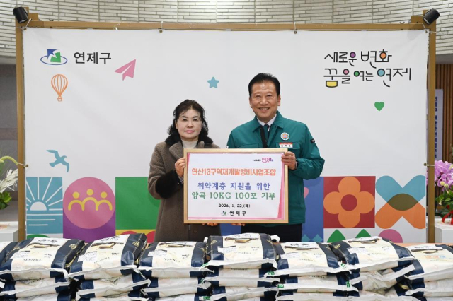 연제구(구청장 주석수)는 지난 22일 연산13구역 재개발정비사업조합(조합장 천선혜)으로부터 취약계층 지원을 위한 백미 1000kg(246만 원 상당)을 전달받았다.