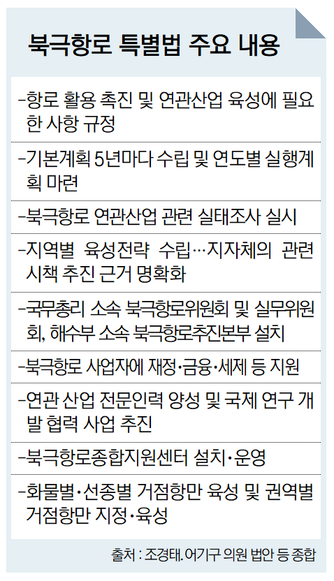 부산을 비롯한 동남권을 중심으로 한 북극항로 개척을 뒷받침하기 위한 특별법이 이번 주 최종 정리된다.