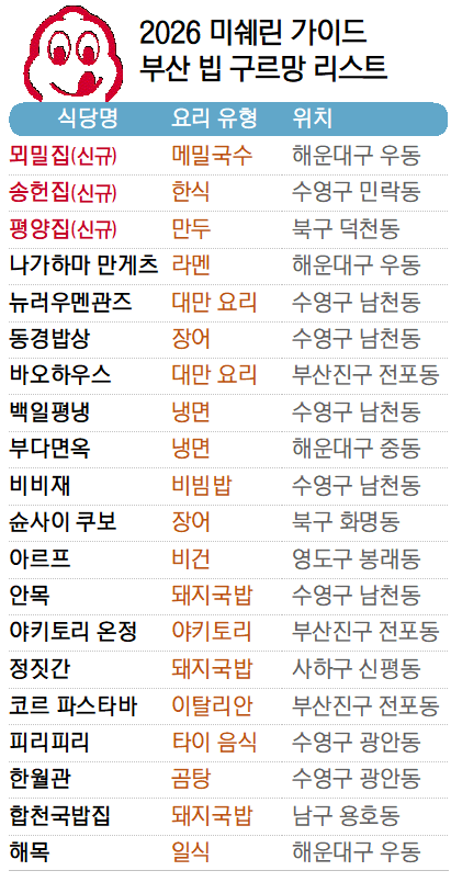 다음 달 5일 ‘미쉐린 가이드 서울&부산 2026’ 전체 레스토랑 셀렉션 발표를 앞두고, 미쉐린 가이드가 빕 구르망(Bib Gourmand) 리스트를 먼저 공개했다. 부산에서는 20곳이 이름을 올렸으며, 이 가운데 3곳이 새로 합류했다.