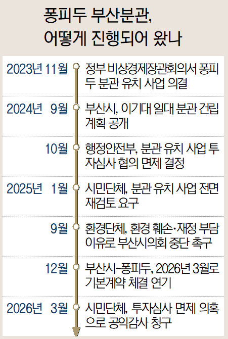 부산시가 추진 중인 프랑스 퐁피두센터 분관 유치 사업의 기본계약 시한이 한 차례 더 연기된다. 당초 이달 말까지 기본계약을 체결하기로 했지만, 시민단체의 공익감사 청구에 시가 감사로 시시비비를 가린 후 추진하겠다며 계약 일정을 연기했다. 감사 개시 여부가 결정되는 5월까지 퐁피두 관련 일정은 멈출 것으로 예상된다.