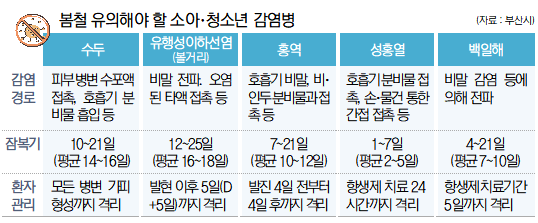 부산시는 최근 5년간 소아·청소년기에 발생이 많은 수두, 백일해, 유행성이하선염, 성홍열 등이 매년 3월부터 서서히 증가하는 추세를 보인다고 19일 밝혔다. 수두와 유행성이하선염의 경우 3월부터 늘어나기 시작해 4~6월에 환자 발생이 가장 많았다. 신 교수는 “이 시기 대표적인 감염병으로 수두, 유행성이하선염(볼거리), 홍역, 인플루엔자 등이 있으며 최근에는 성홍열과 백일해도 영유아와 초등학교 저학년에서 다시 증가하는 양상이 보고되고 있다”라고 말했다.