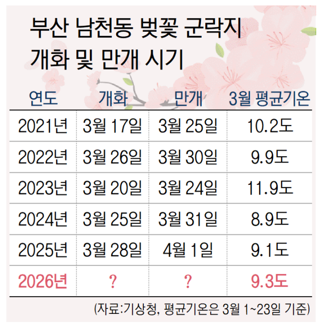 벚꽃 개화 시기는 2월과 3월의 기온 변화와 일조시간, 강수량 등에 큰 영향을 받는다. 올해 3월 1~23일까지의 부산의 평균기온은 9.3도로 집계되었다. 이는 지난해 9.1도, 2024년 8.9도보다 높은 수준이다. 역대급으로 따뜻했던 2023년의 11.9도에는 미치지 못하지만, 최근 2년과 비교하면 기온이 완만하게 상승하는 추세다.