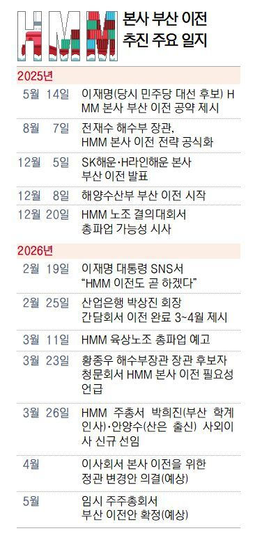 HMM 본사 부산 이전은 이재명 대통령의 대선 공약이자 해양수도 육성의 핵심 과제다. 황종우 해수부 장관, 박상진 산업은행 회장 등도 본사 이전에 의지를 나타내고 있는 상황이다. 해운정책을 총괄하는 해수부, HMM 대주주이자 해운 지원 업무를 수행하는 한국해양진흥공사 본사 역시 부산에 자리하고 있어 정책·산업 간 집적 효과에 대한 기대도 크다.