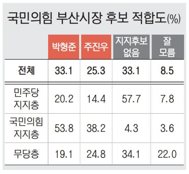국민의힘 부산시장 후보 적합도 조사에서 박형준 현 부산시장이 주진우(해운대갑) 의원을 오차범위 밖에서 앞서는 것으로 나타났다. 특히 박 시장은 연령, 지역, 정치성향 등 대부분의 항목에서 주 의원에게 우위를 보였다. 다만 부동층이 40%가 넘어 최종 승패를 예단하기 어렵다는 관측이 많다.