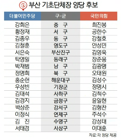 민주당의 경우 지난 2018년 ‘민주당 바람’ 속에서 당선됐던 전직 구청장들이 탈환에 나선다. 서은숙 전 부산진구청장, 박재범 전 남구청장, 정명희 전 북구청장, 홍순헌 전 해운대구청장, 김태석 전 사하구청장, 김철훈 전 영도구청장이 전면에 나서는데 전·현직 리턴매치에도 관심이 집중된다.