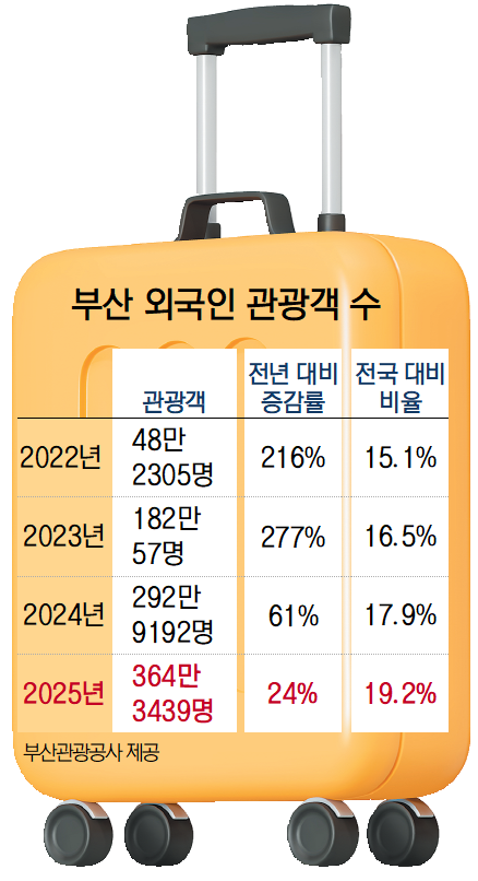 이 같은 경향은 최근 들어 더욱 뚜렷해진다. 2024년 부산에 방문한 외국인은 292만 9192명으로 전년 대비 61% 급증했고, 전국 대비 비중 역시 17.9%로 확대됐다. 특히 코로나19 이후 회복 국면이 시작된 2023년에는 182만 57명을 기록하며 전년 대비 277% 폭증했고, 2022년에도 전년 대비 216% 증가하는 등 가파른 성장세를 이어왔다.