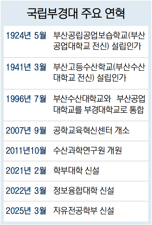 두 대학은 1996년 시대적 요구에 부응해 전격적인 통합을 결정하며 국립대학 발전 방향의 새로운 이정표를 제시했다. 통합 이후 국립부경대는 연구 중심 대학으로서의 위상을 공고히 하기 위해 1998년 경영대학원, 2006년 국제대학원(현 글로벌정책대학원), 2013년 글로벌수산대학원, 2016년 기술경영전문대학원을 차례로 신설했다. 최근에는 2021년 학부대학, 2022년 정보융합대학을 신설하며 미래형 융합 교육 체계를 선도하고 있다.