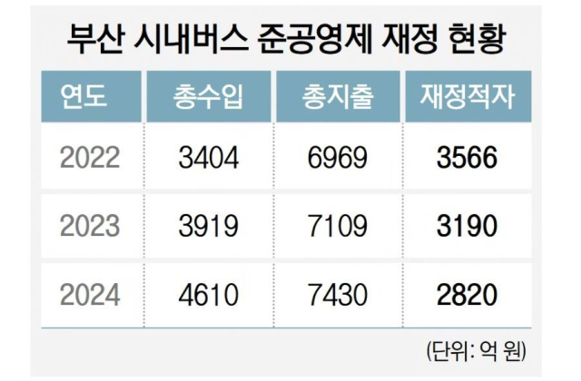 부산시 대중교통과 관계자는 “노선 개편 등 준공영제 효율성을 높여 재정 적자를 줄일 수 있는 방법을 검토하겠다”고 밝혔다.