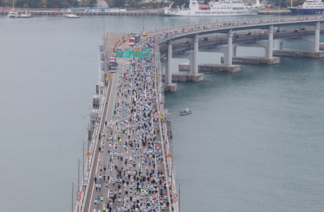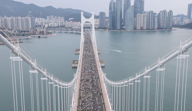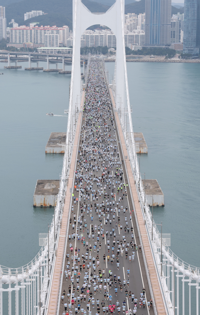 부산일보가 주최한 ‘2025 성우하이텍 부산바다마라톤’ 대회가 26일 오전 부산 광안대교와 광안리 일원에서 펼쳐졌다. 참가자들이 출발지인 광안대교로 이동하고 있다. 김경현 기자 view@