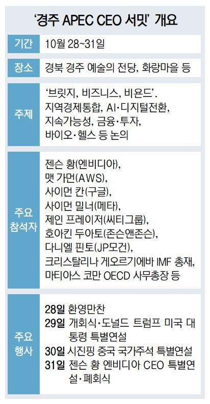 경북 경주에서 31일부터 열리는 아시아태평양경제협력체(APEC) 정상회의에 앞서 열리는 공식 부대 행사인 ‘APEC 최고경영자(CEO) 서밋’이 28일 개막했다. 글로벌 인공지능(AI) 확산을 이끄는 엔비디아의 창립자 겸 CEO인 젠슨 황을 비롯해 세계를 대표하는 기업인들이 한자리에 모여 글로벌 경제 전략과 협력 방안을 논의할 예정이다.