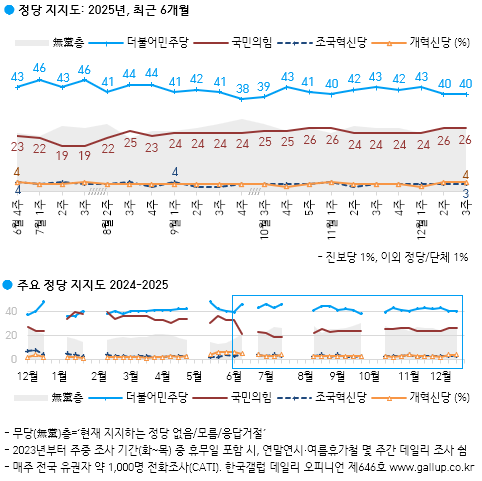 민주·국힘 지지율 40%·26%…PK는 30%·33%[한국갤럽]