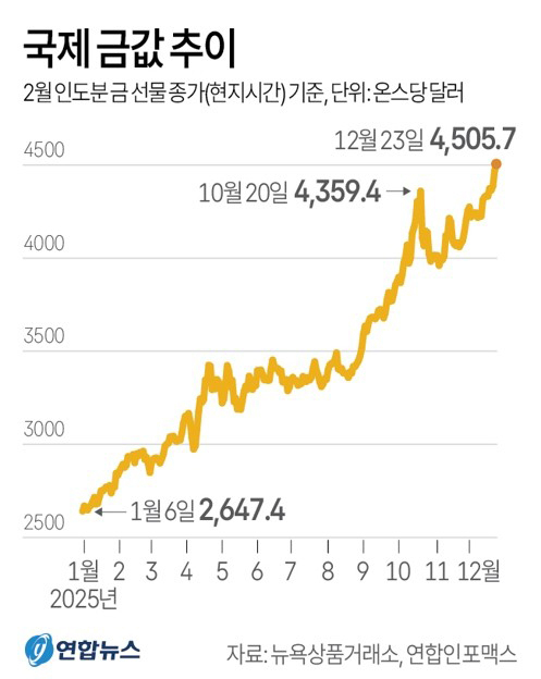 국제 금값 역시 지난 27일 기준 온스당 4532.29달러로, 사상 최고치를 경신했다.