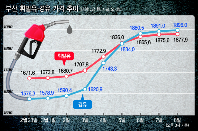 부산에서도 2월 28일 L당 1671.8원이던 휘발유 가격이 3월 4일엔 1772.9원으로 올랐고 5일엔 1800원도 돌파했다. 8일(오후 3시 기준)엔 1877.9원에 달했다. 경유가격은 더 올라 2월 28일 1576.3원이던 가격이 8일엔 1896.0원으로 300원 넘게 상승했다. 특히 경유 가격이 휘발유 가격을 추월하는 현상도 나타났다.