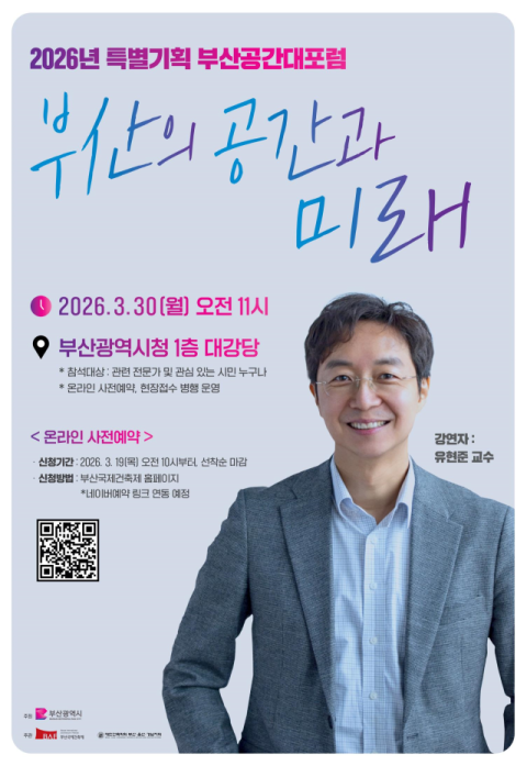 부산시(시장 박형준)는 건축과 도시를 통합적으로 바라보는 새로운 정책 방향을 논의하기 위해 '부산의 공간과 미래'를 주제로 한 ‘2026년 특별기획 부산공간 대포럼’을 오는 30일부터 4월 1일까지 3일간 개최한다고 밝혔다.