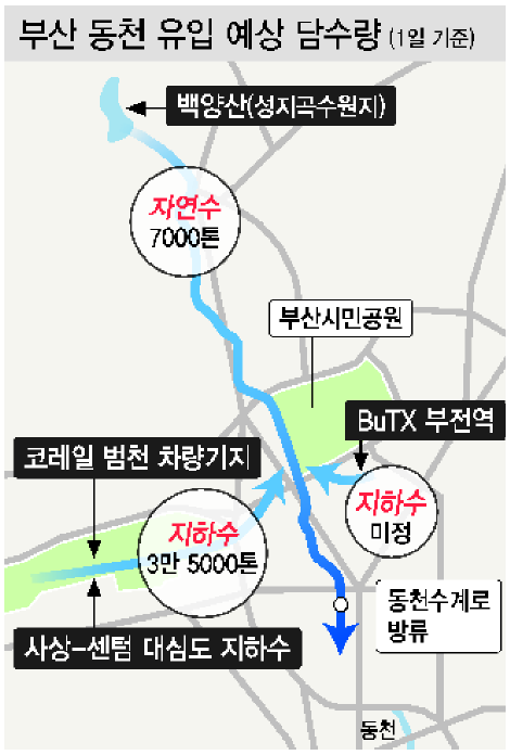 수질 개선에 어려움을 겪어온 동천에 정화용 담수가 투입된다. 효율이 기대에 미치지 못했던 바닷물 대신 대심도 현장에서 확보한 지하수를 동천으로 흘려보내는 식으로 수질 개선 정책을 바꾸겠다는 게 부산시의 설명이다.