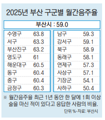 13일 질병관리청에 따르면 최근 1년 동안 한 달에 1회 이상 술을 마신 적이 있는 월간음주율은 57.1%로, 전국 17개 시도 모두 전년보다 감소했다. 부산의 월간음주율은 2024년 61.4%에서 2025년 59.0%로 줄었다. 구군별로는 강서·금정·동·서·영도구를 제외한 11개 구군에서 월간음주율이 감소했다. 부산에서 월간음주율이 높은 지역은 수영구(63.8%), 서구(63.3%), 부산진구(63.2%), 영도구(61%) 순이었다.